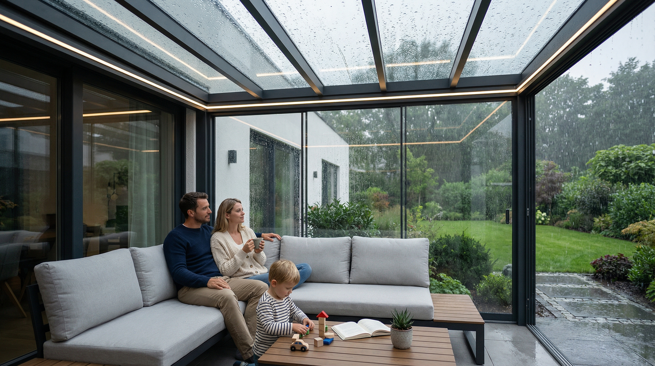 Das integrierte Entwässerungssystem führt Regenwasser diskret ab, während die Aluminium-Konstruktion selbst bei Sturm standhält. So können Sie auch an regnerischen Herbsttagen Ihre Terrasse genießen – typisch norddeutsch eben.
