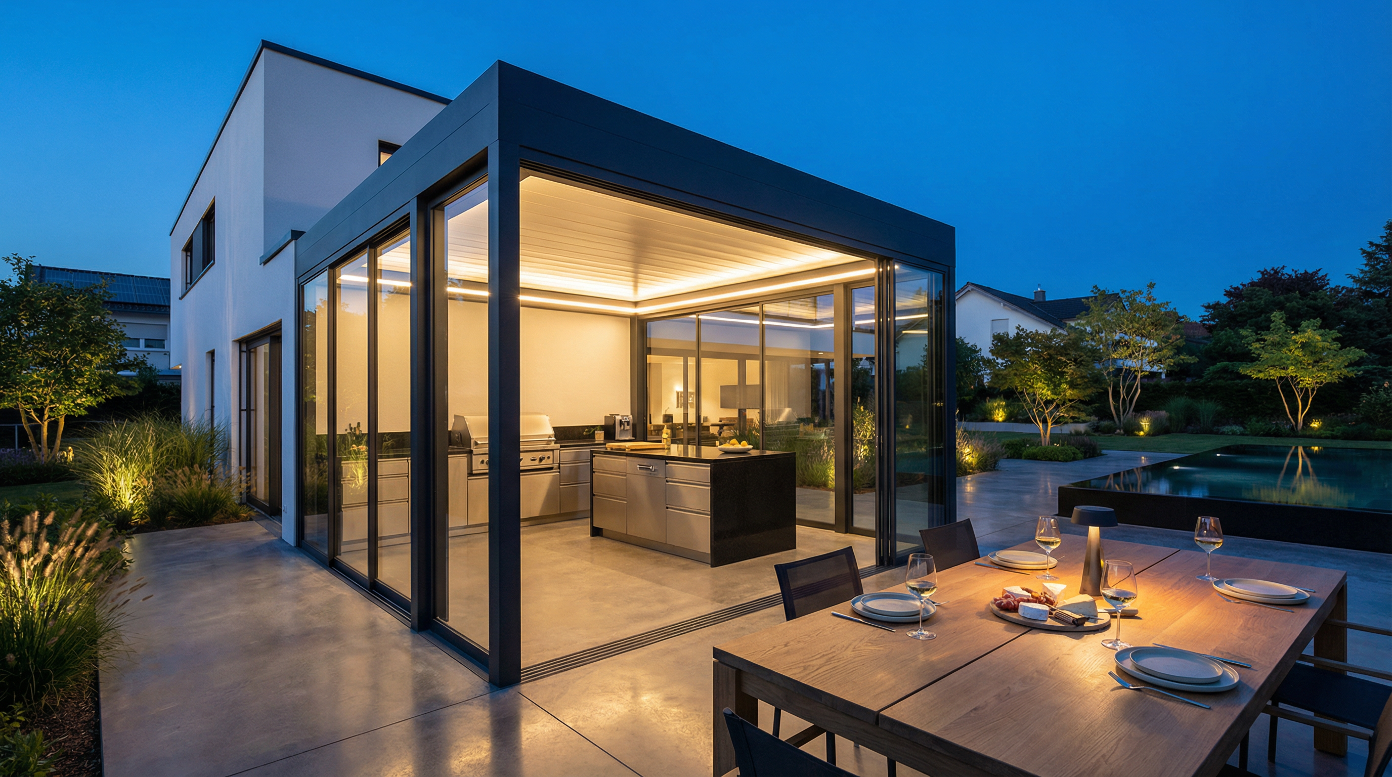 Verwandeln Sie Ihr Terrassendach mit Glasschiebewänden in einen Kaltwintergarten – flexibel nutzbar bei jedem Wetter.