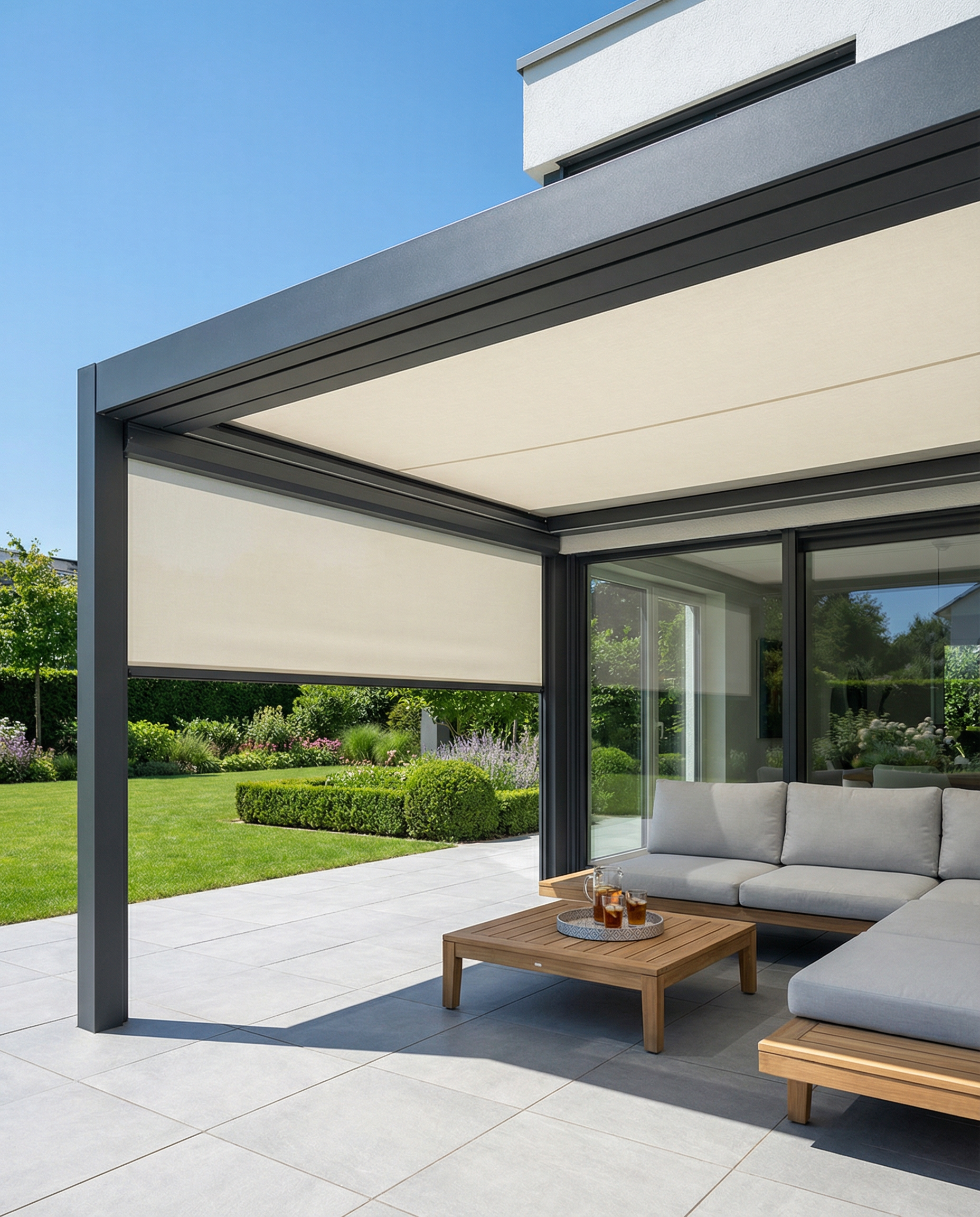 Integrierte Markisen bieten angenehmen Schatten an heißen Sommertagen und lassen sich bequem per App steuern.
